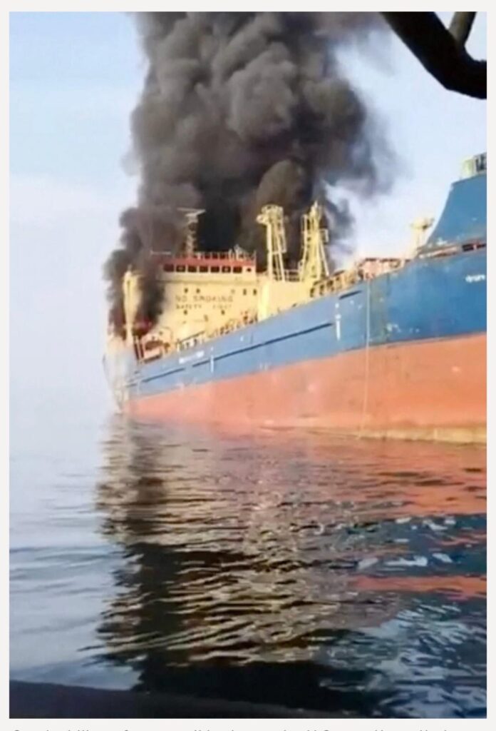 Sanctioned tanker hit off Oman (screen grab from Reuters, 1.3.26)